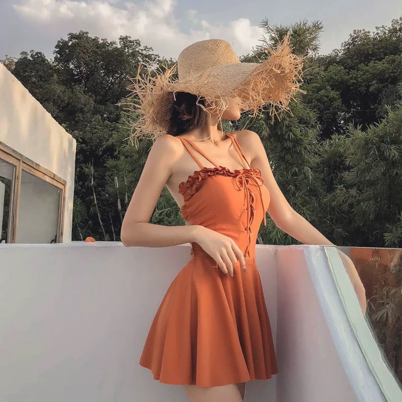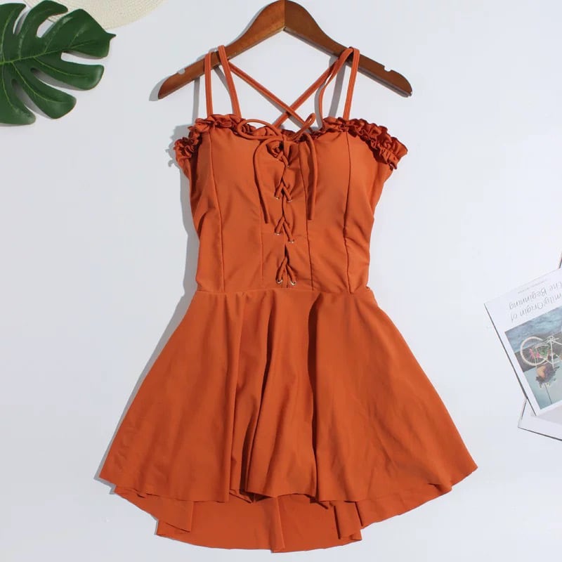 胸元ギャザーとレースアップが大人かわいいワンピース水着